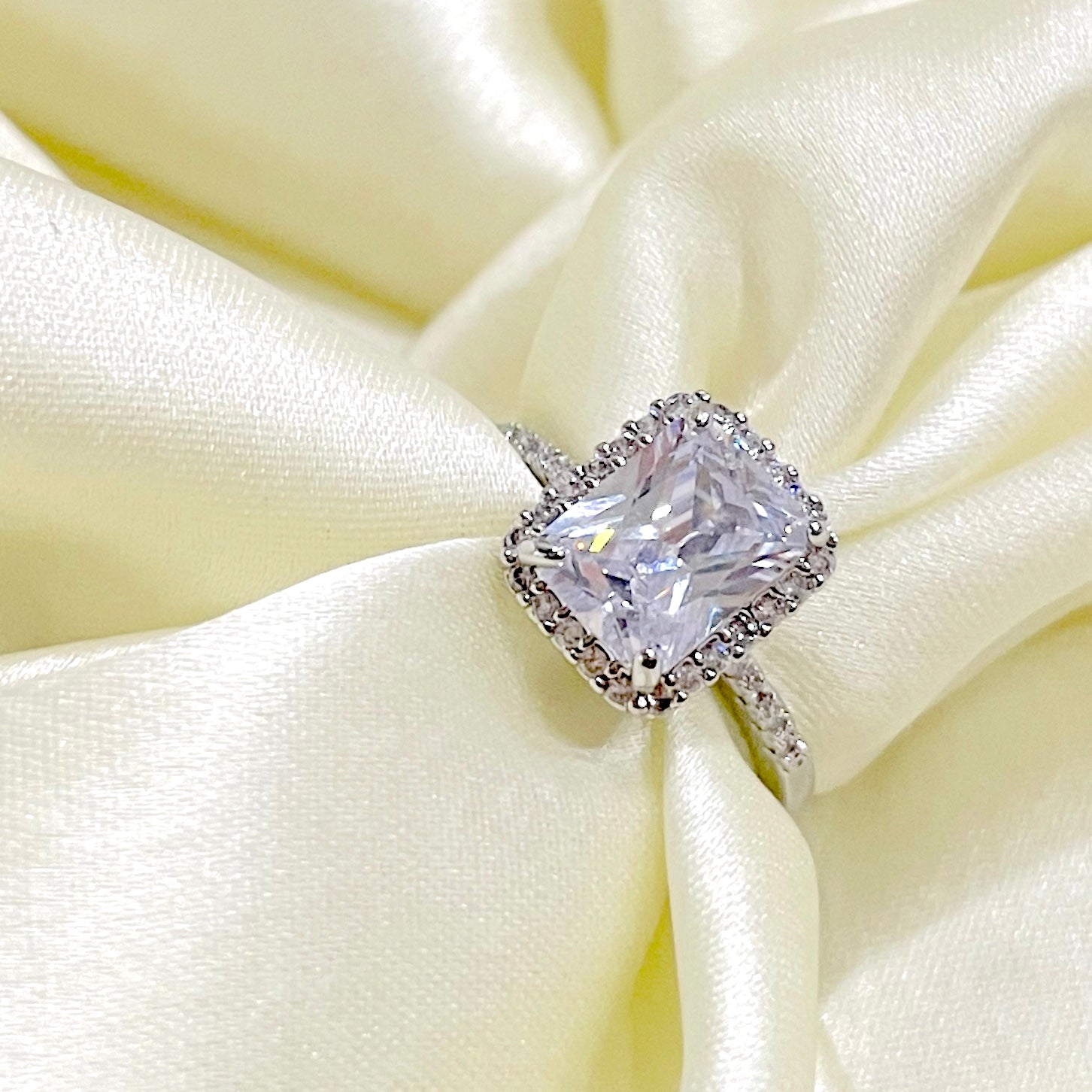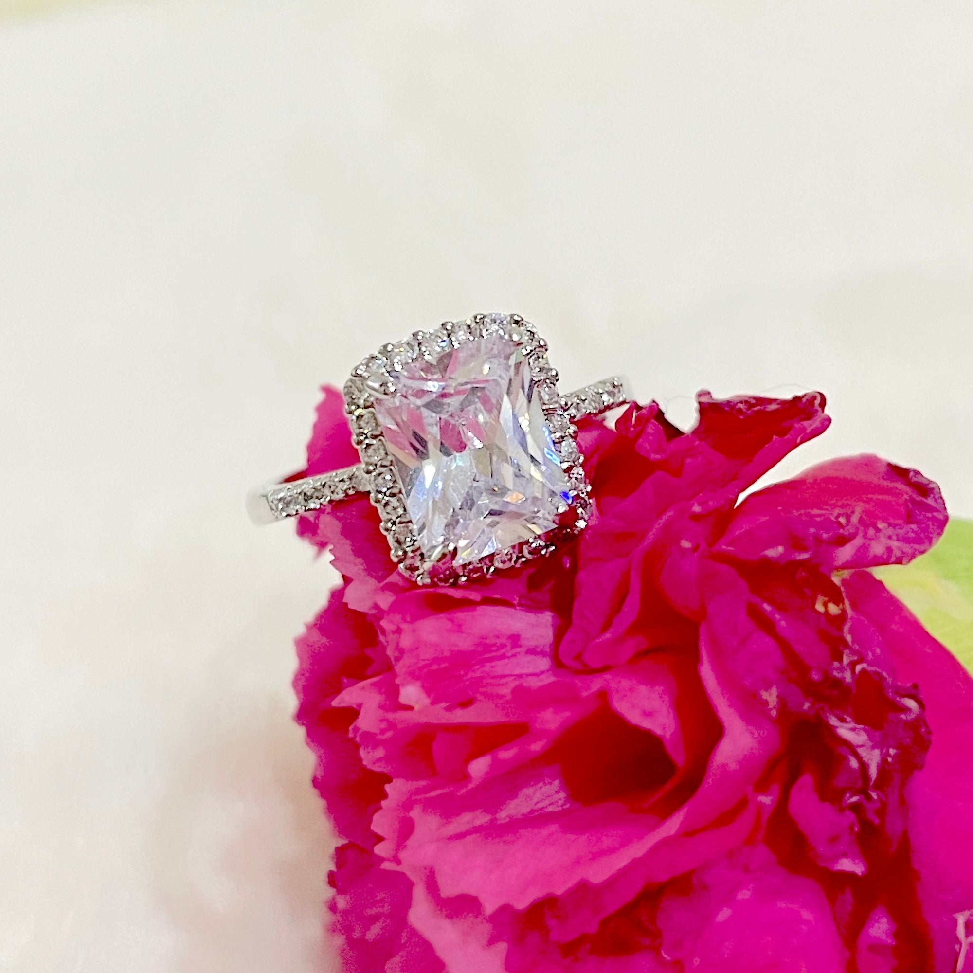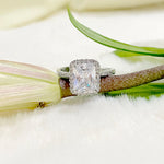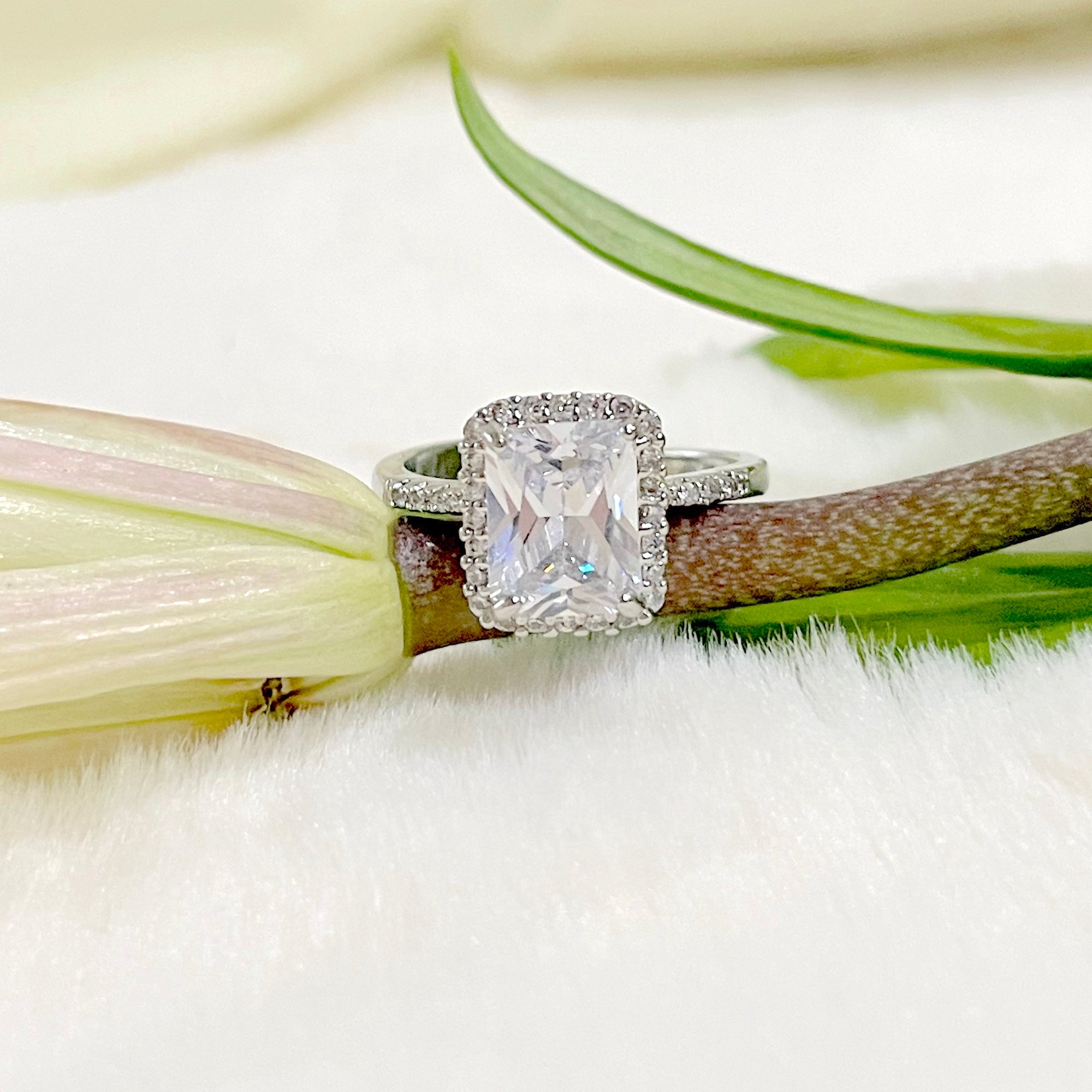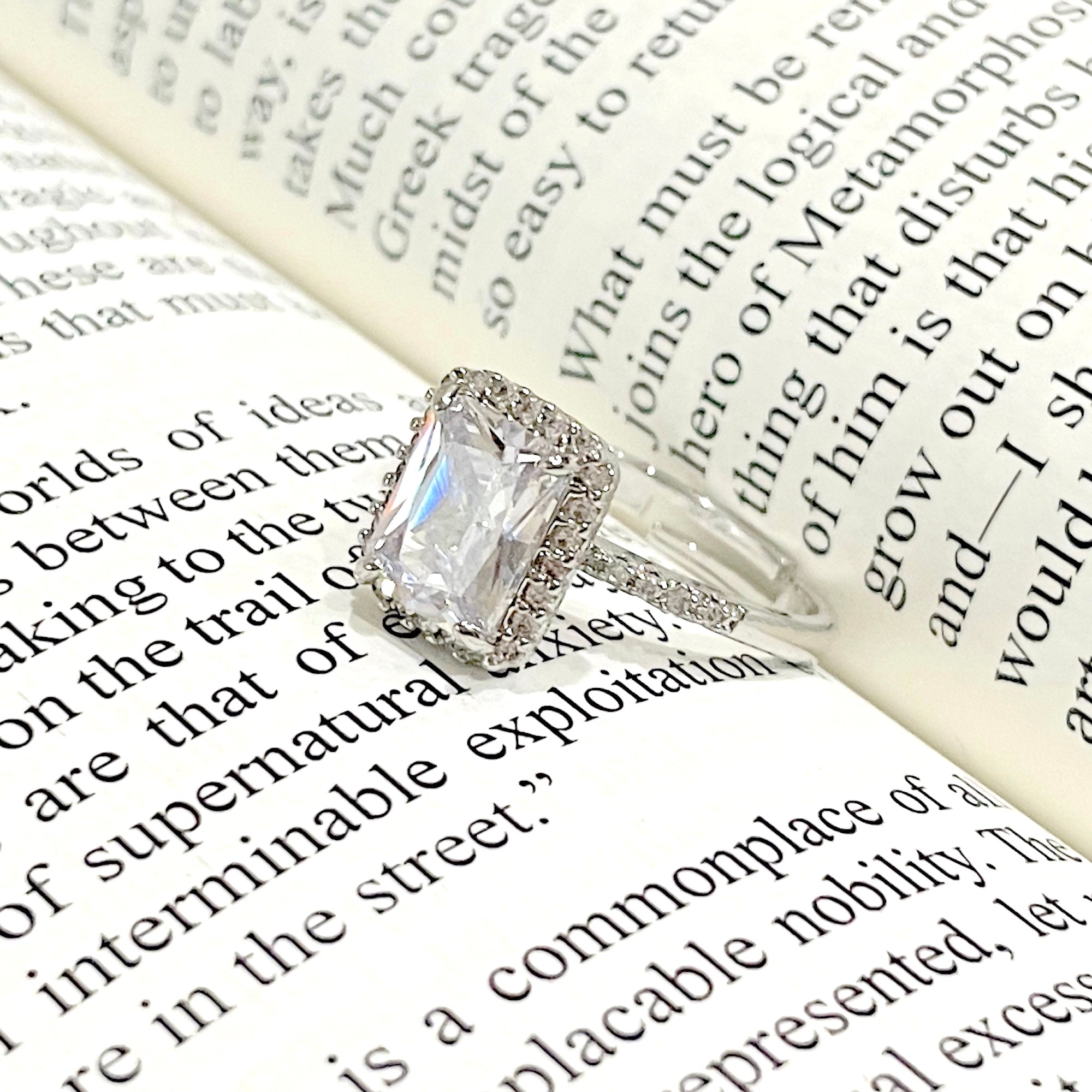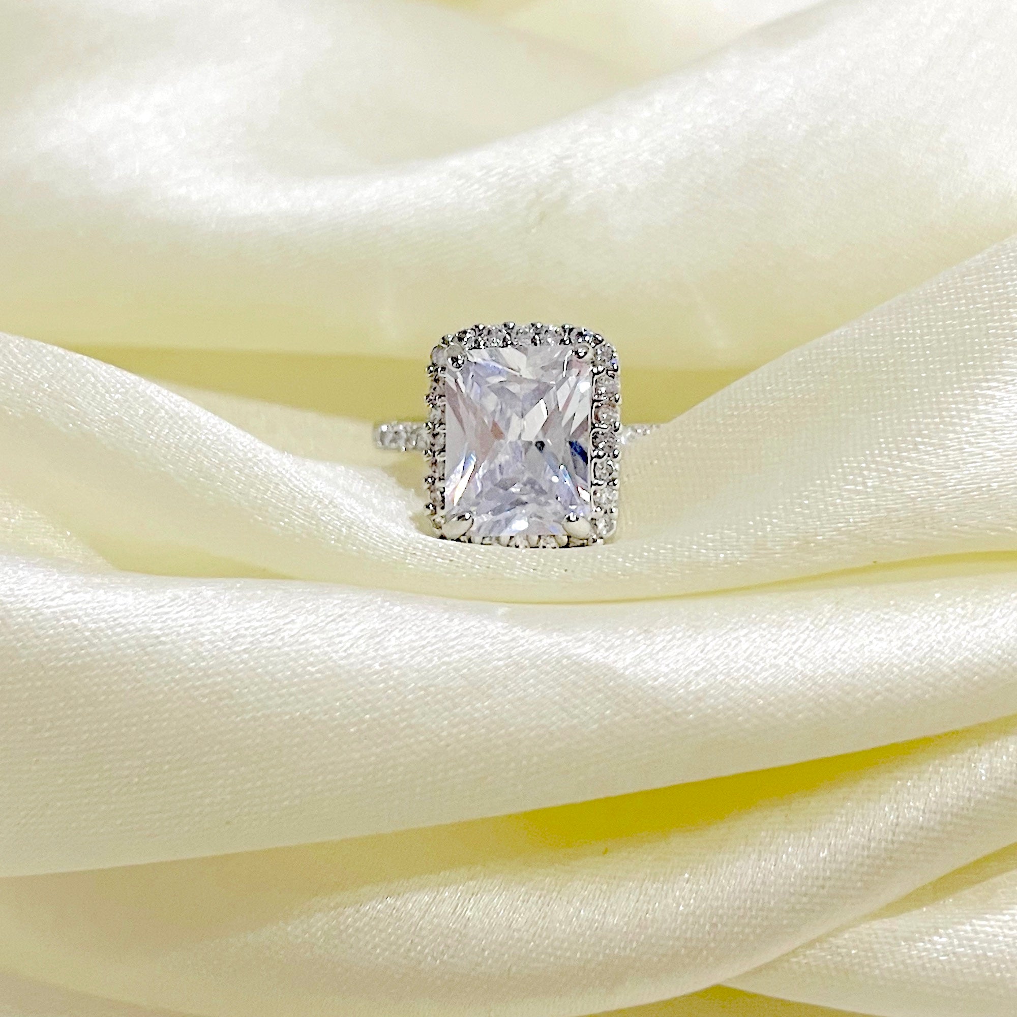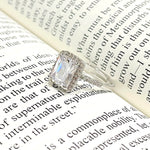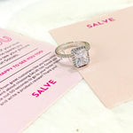 Salve ‘Princess’ Silver Solitaire Halo Ring | Emerald Cut, Anti-Tarnish, Zircon Studded
