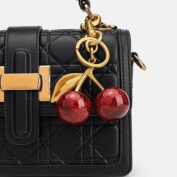 - Keychain for Bag: Our unique keychain features vibrant cherries that are attached to a sleek gold-toned metal stem, complete with a beautifully sculpted gold leaf that adds a touch of pizzaz.