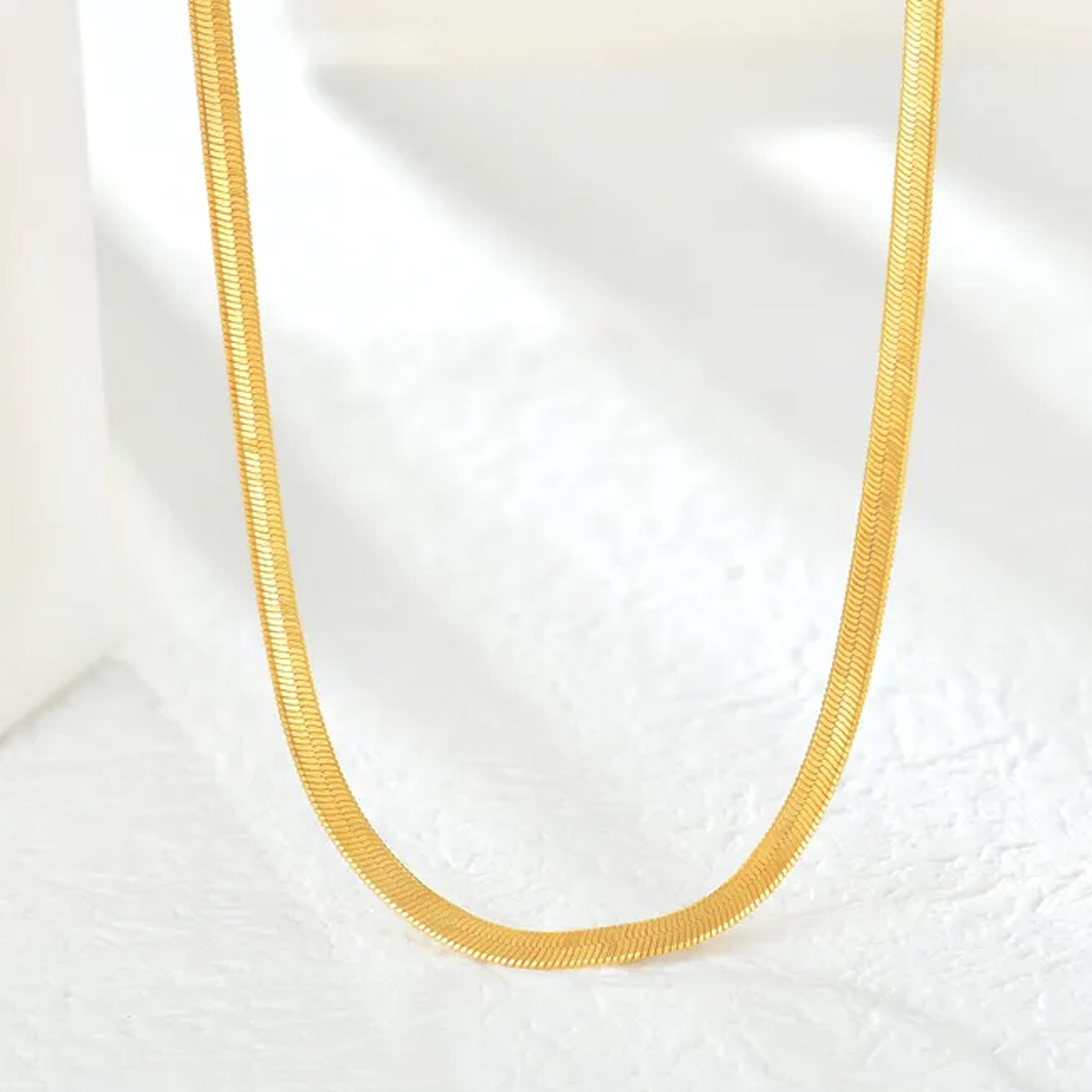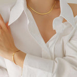 • The necklace features a sleek, fluid snake chain for women that drapes beautifully across the neckline, paired with a matching gold bracelet for women in the same chic silhouette, creating a harmonious balance.