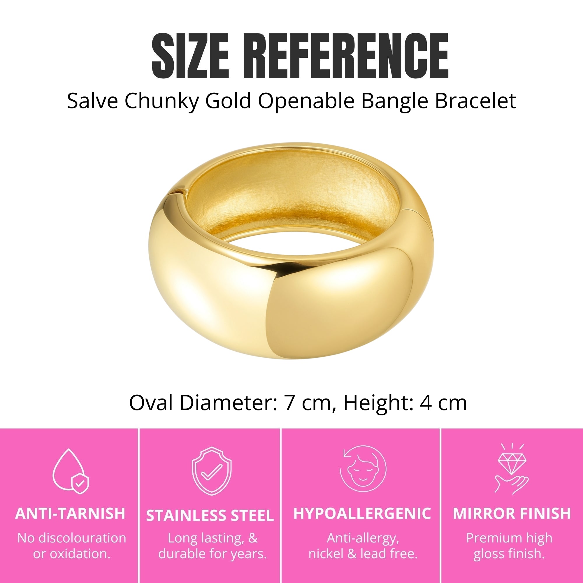 • Timeless Classic Hand Bracelet for Women: Crafted for the proud maximalists, the Salve Chunky Gold Bangle Bracelet is your go-to statement women's bracelet—bold, radiant, and designed to elevate every fit.