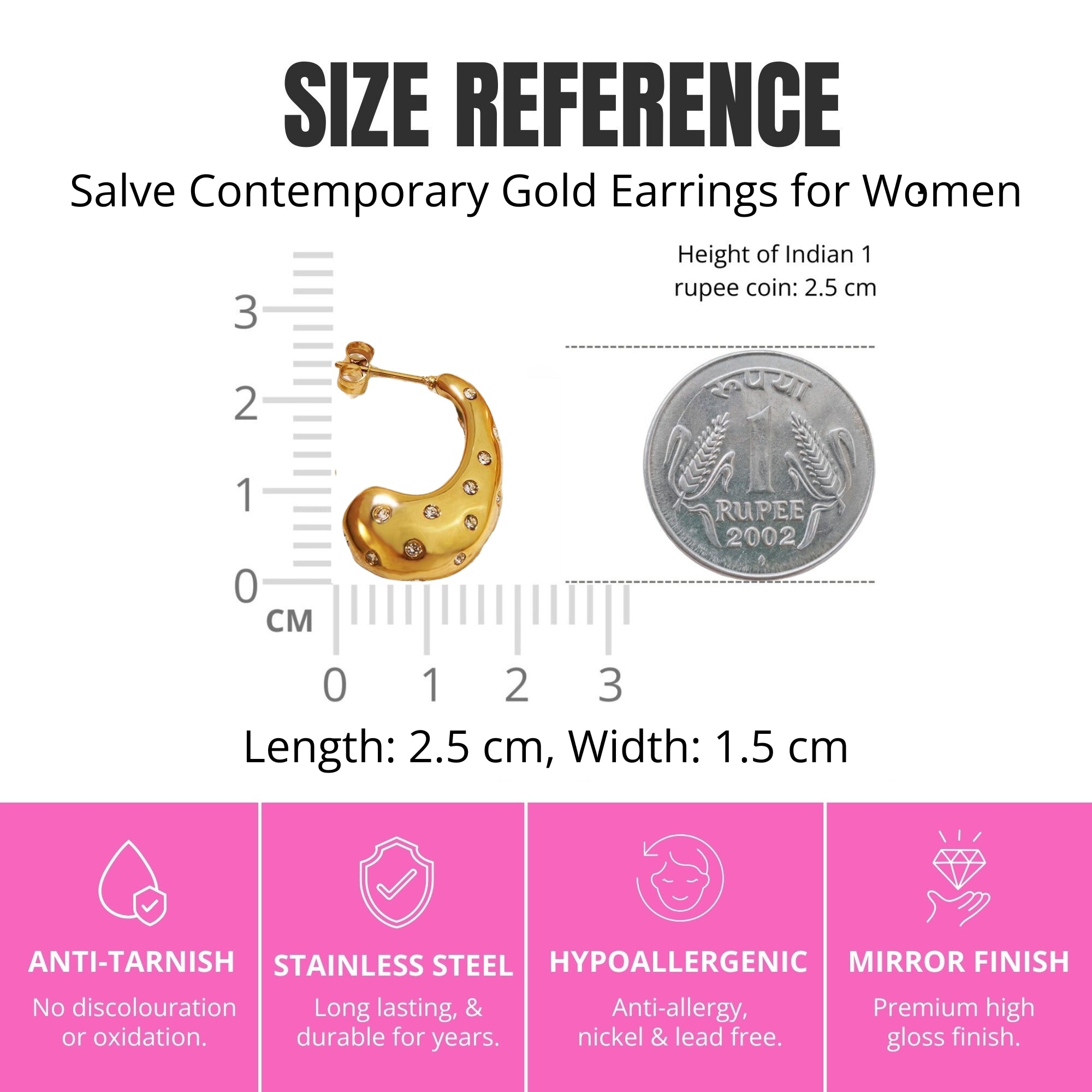 • Salve Style Tip: The textured finish & bold silhouette give these golden earrings for women an effortlessly luxe look. Pair these with your favourite black dress with a sleek bun & a gold bracelet stack.